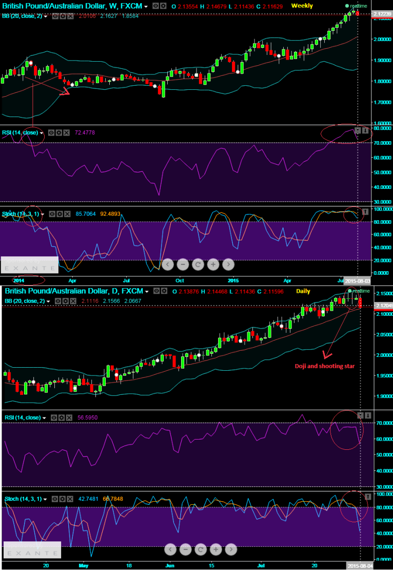 Slow stochastic on the other hand also evidences overbought scene as %D line crossover above 80 levels which is again overbought zone. The same was confirmed with daily charts as both leading oscillators evidence the same situation and substantiated better with some bearish candles such as Doji and shooting star patterns at 2.1376, 2.1378 and 2.1387 respectively. Currently on weekly charts, RSI is trending at 72.2698, %D line at 92.5050 while %K line at 85.8124 levels.