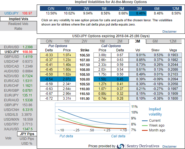 Thus, we advocate buying USDJPY 1y put spread strikes 106/103, global knock-in 116 Indicative offer: 0.33% (vanilla: 0.75%, spot ref: 109.029).