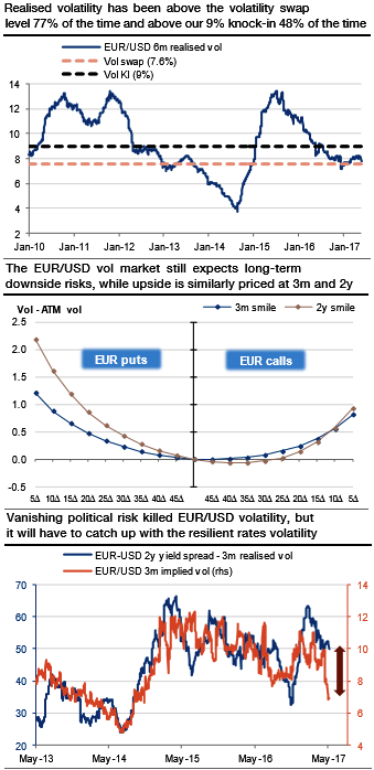 In our view, relative rates volatility currently better captures central bank stances than EURUSD volatility. Lastly, FX vol has been extremely focused on short-term political risk, and its valuation has diverged from its medium-term pattern. As the market now sees reduced political fears and is refocusing on the modalities of ECB tightening, the case for more Euro bullishness and more volatility is resurfacing.