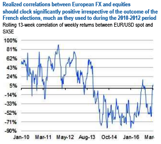 Investors have already started to take advantage of this dislocation and forced short-dated (<3M) EURUSD vs. SX5E correlations up to +25%, but there is still room for the move to play out in longer tenors.