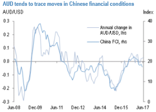 AUD has traced China’s on-again off-again policy shifts on financial conditions and liquidity reasonably well over the past 9 years (refer above chart).