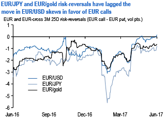 this week in sub-3M expiries in response to Euro strength, but there are still two laggards among Euro-crosses that are bid for EUR puts and have room to play catch-up (refer above chart) if Euro strength continues: EURJPY (3M 25D r/r -0.8mid) and EUR/gold (3M 25D r/r -0.65 mid).