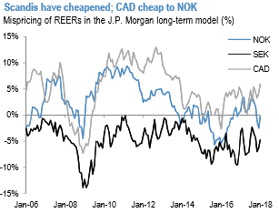 Norway and Sweden are experiencing strong growth but are at different stages of their cycles: Sweden’s expansion has decelerated, whereas Norway is playing catch-up. Meanwhile, Sweden’s housing market is probably a bigger risk than Norway’s. Real house prices have increased faster in Sweden, raising more financial stability risks and potentially a higher risk of a central bank policy mistake (the market has kept in mind the Riksbank’s dangerous tactic of ‘leaning against the wind’). Moreover, NOK rates have delivered decent carry, whereas SEK short rates are still anchored in negative territory.