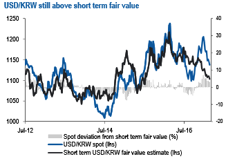 Higher commodities since the start of the year have also been a factor, while yield spreads have broadly moved sideways over this period. We have seen spot USDKRW trend towards the fair estimate but there is still a reasonable wedge between the two series (albeit not as large as it was at the start of the year).