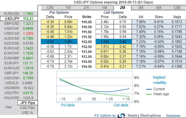 The execution: If you ponder upon cost effectiveness and wouldn’t like to divert exposure, we advocate buying USDJPY 2w/2m put ratio back spread strikes 112.634/110.595 (2 lots), (vanilla: 0.75%, spot ref: 112.330). A 2:1 put back spread can be implemented by buying a number of puts at a higher strike and buying twice the number of puts at a lower strike.