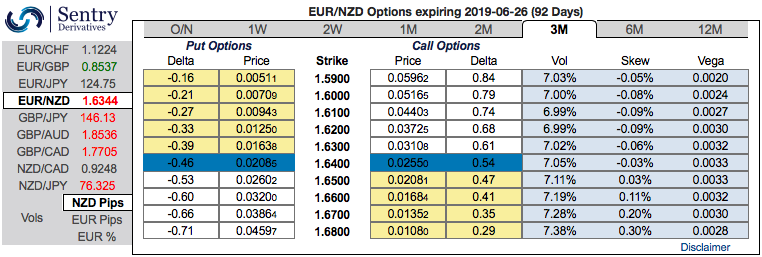 OTC outlook and Hedging Strategy: Please be noted that the positively skewed IVs (implied volatilities) of 3m tenors signify the hedgers’ interests in the upside risks (refer above nutshell). Bids for OTM calls strikes up to 1.68 levels are observed ahead of RBNZ monetary policy.