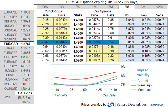 The EURCAD appreciation is now going to be slower than it has recently been as the CAD likely to gain traction on crude price support, while the skew is still undecided whether volatility should rise on the back of a higher or lower spot (refer above nutshell evidencing IV positive skews well balanced & stretched on both OTM calls and OTM puts).