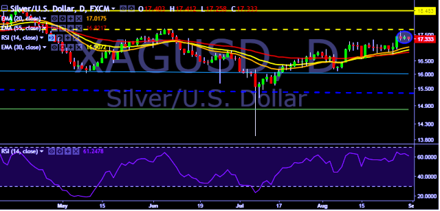 We prefer to go long on XAG/USD around $17.28 with stop loss at $17.11 and target of $17.42/$17.64/$17.76.