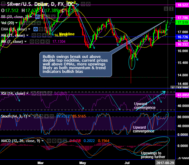 On daily plotting, historically, the double top pattern has occurred in silver price chart with peak 1 at 18.485 (that is where Back to back “shooting star” candle patterns are traced out), peak 2 at 18.647 and neckline at 16.847 levels. Currently, we’ve seen that bulls have tested supports at the same juncture. Prior to which, the bullish swings break out above double top neckline when lagging indicator shown bullish DMA crossover.