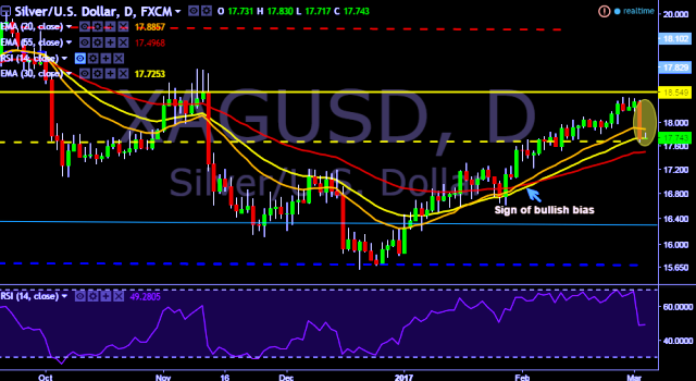 We prefer to go short on XAG/USD around $17.78, stop loss at $18.01 and target of $17.51/$17.38.