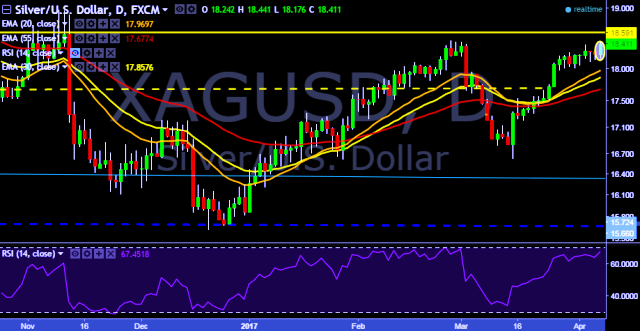 We prefer to go long on XAG/USD around $18.34 with stop loss at $18.14 and target of $18.46/$18.72.