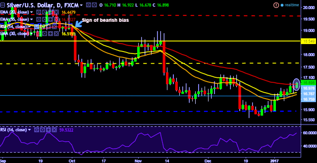 We prefer to go short on XAG/USD around $16.90 with stop loss at $17.08 and target of $16.51.