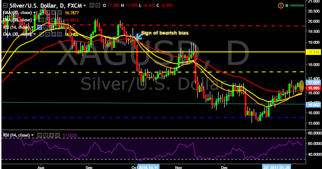 We prefer to go short on XAG/USD around $17.02 with stop loss at $17.12 and target of $16.80.