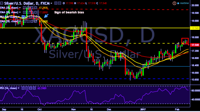 We prefer to go short on XAG/USD only below $17.52 with stop loss at $17.62 and target of $17.38.