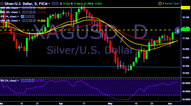 We prefer to go long on XAG/USD around $17.58 with stop loss at $17.48 and target of $17.72/$17.98.