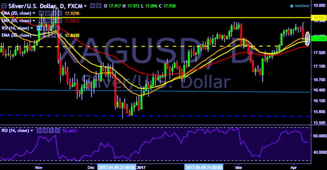 We prefer to go long on XAG/USD around $17.90 with stop loss at $17.72 and target of $18.08/$18.22.