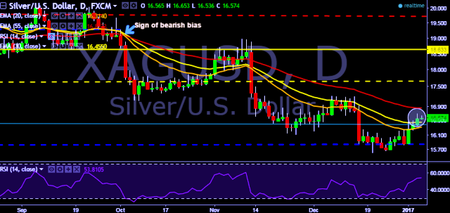 We prefer to go short on XAG/USD around $16.58 with stop loss at $16.70 and target of $16.37/$16.23/$16.02.