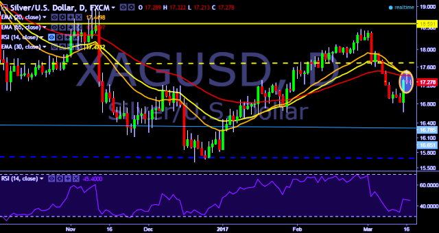 We prefer to go long on XAG/USD only above $17.32 with stop loss at $17.00 and target of $17.75.