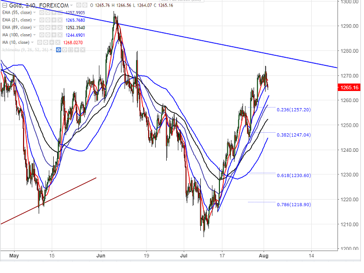 - Gold’s near term support is around $1264 (4 Hour Kijun-Sen) and break below will drag the commodity down till $1257 (55- 4H EMA)/$1247 (38.2% fibo).The yellow metal should break below $1195 for major trend reversal.