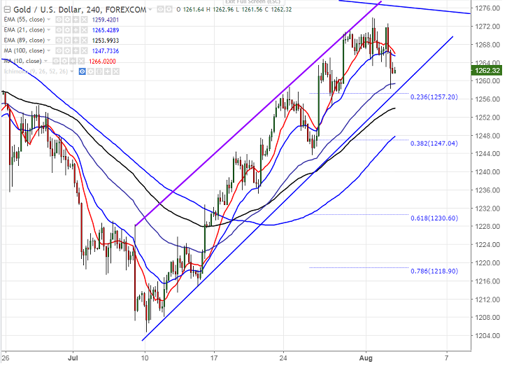 - Gold’s near term support is around $1257 (23.6% retracement of $1204 and $1273.82) and break below will drag the commodity down till $1250 (21- day EMA)/$1243 (Jul 26th low).The yellow metal should break below $1195 for major trend reversal.