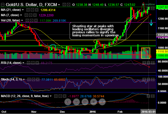 Yellow metal seems to have lost the momentum in upswings ever since it has formed a shooting star at 1228.73 levels (see red colored cirle).