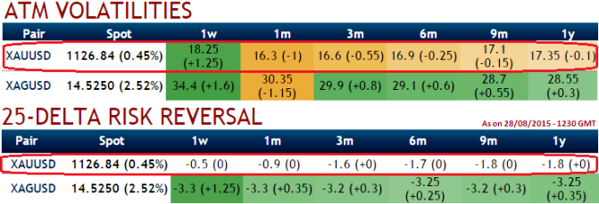 We have obtained a position that would gain value for an increase in underlying price from 1089.15 levels to 1168 levels (this week's top 1170), but for now delta risk reversal is shifted into red zone again with increased volatility. Gold was fallen to a 5.5 years low of $1,073.53 on 20th July amid the Fed's speculation of rising interest rates in September for the first time since 2006. Since then we already reiterated the prices to have rebound approximately 3%.
