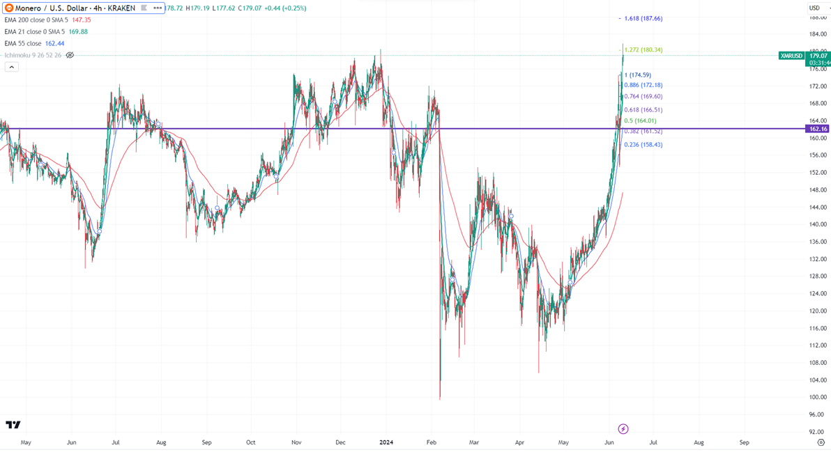 XMRUSD gained more than 15% in the past two days.The pair holds well above the short-term (21 and 55 EMA) and long-term moving average. It hit a high of $181.82 nd is currently trading around $177.35.