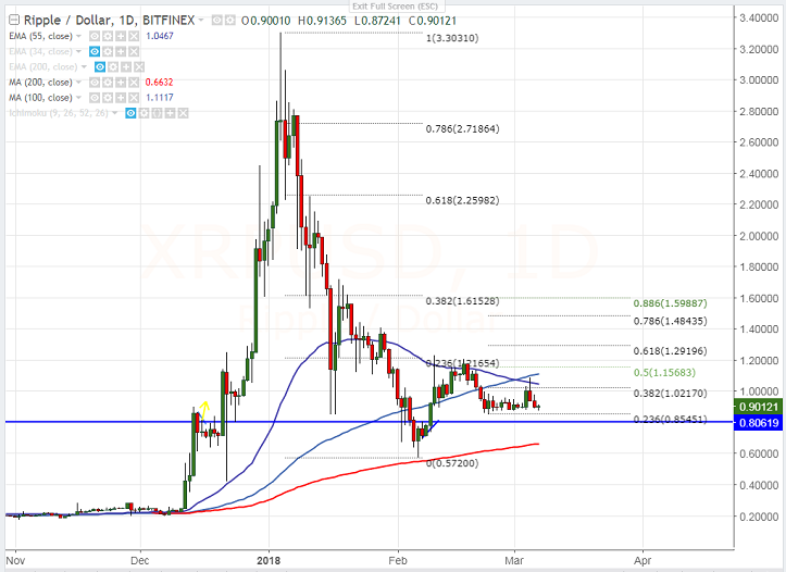 - Ripple has declined slightly after hitting high 1.0850 level. The pair has closed well below 100- day MA for five trading session. It is currently trading around 0.90649.
