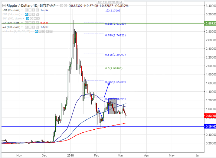 - Ripple is continuing its weakness for the past 18 days after hitting high 1.2000 level. The pair has closed well below psychological level 1 and is currently trading around 0.8405.
