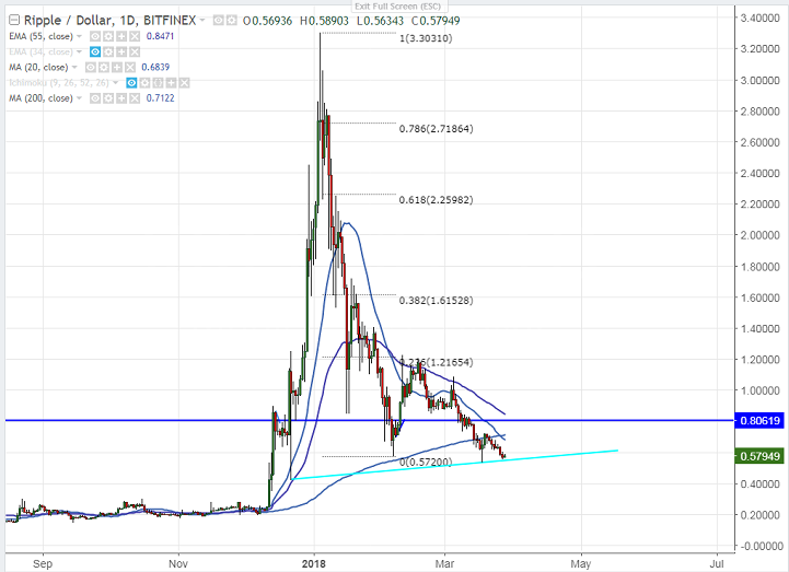 - Ripple is trading weak after hitting high of 0.7250 on Mar 19th 2018. The pair has declined slightly till 0.5791 from the high and is currently trading around 0.57958.