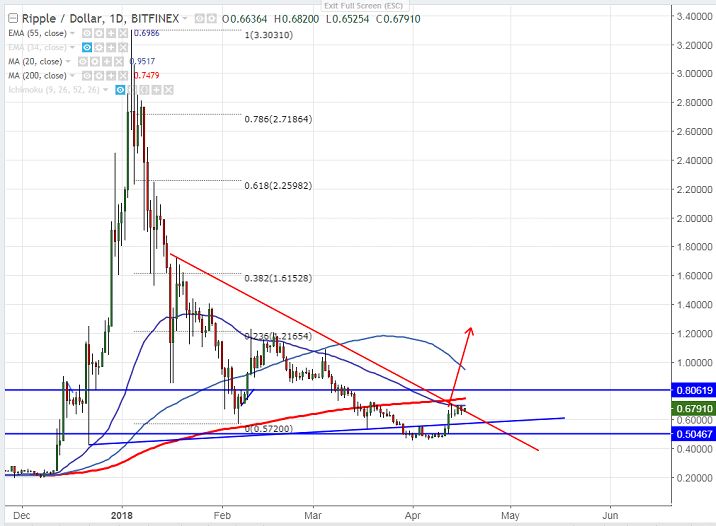 - Ripple has shown a minor recovery after hitting low of 0.63314. The pair was consolidating after a continuous three days of bullishness. It is currently trading around 0.67908. The pair formed almost a double bottom around 0.4500 and major weakness below that level.
