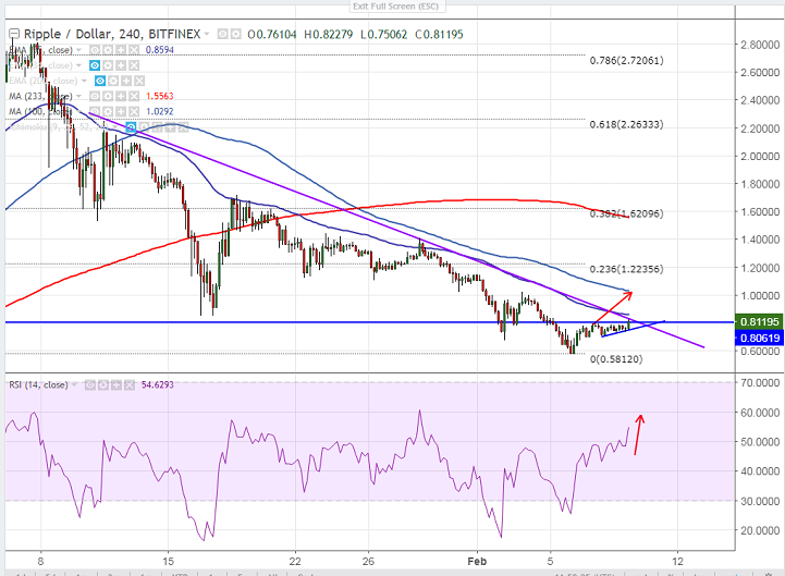 - The pair took support near 233- day MA at 0.49. Ripple hits low of 0.5700 and is showing a minor bullishness from that level. Any major weakness only below 0.4900 level. The pair’s major resistance is around 0.8611 (55- 4H EMA) and any violation above will take the pair till 0.9800 (trend line joining 1.74 and 1.3890)/1.0270/1.0870 (100- 4H MA). Short term bullishness can be seen above 1.72-1.75. Short term bullishness only above 2.25.