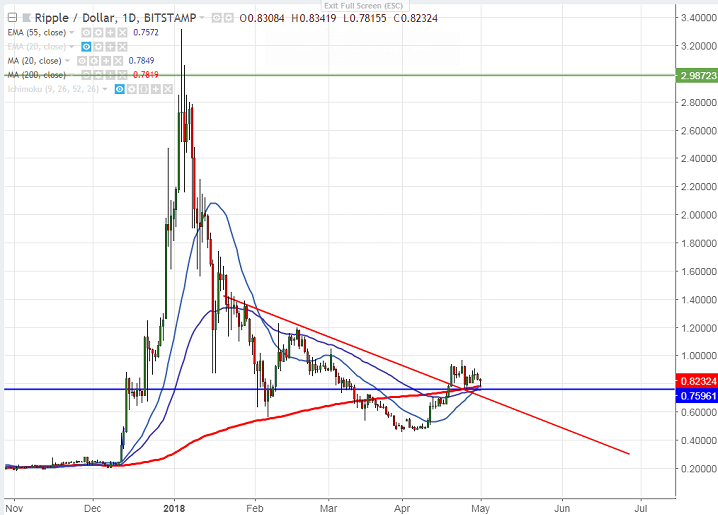 - Ripple is consolidating in narrow range between 0.96490 and 0.7600 for past 7 trading session.0 slightly below 200- day MA. The pair hits high of 0.96490 from low of 0.4500 almost 115%. It is currently trading around 0.82450. Overall trend is bullishness as long as support 0.4500 holds. Any further weakness only below that level. It is currently trading around 0.8240.