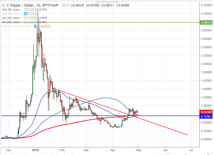 - Ripple has shown a minor jump of 19% after hitting low of 0.76500 slightly below 200- day MA. The pair hits high of 0.96490 and jumped almost 115% from low of 0.4500.It is currently trading around 0.8440. Overall trend is bullishness as long as support 0.4500 holds. Any further weakness only below that level. It is currently trading around 0.8360.