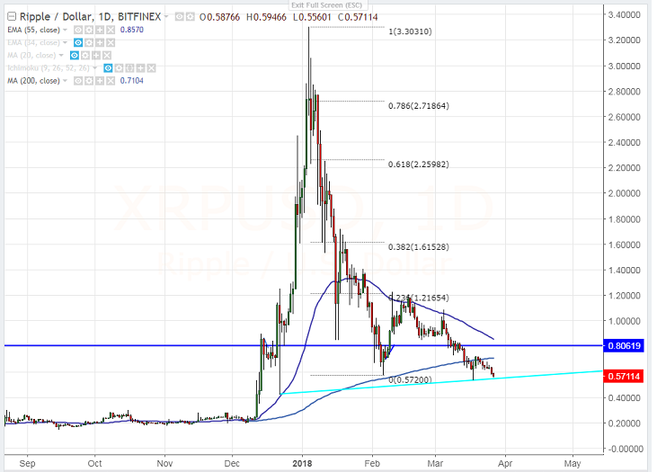 - Ripple is trading weak after hitting high of 0.7250 on Mar 19th 2018. The pair has declined slightly till 0.5791 from the high and is currently trading around 0.5700.