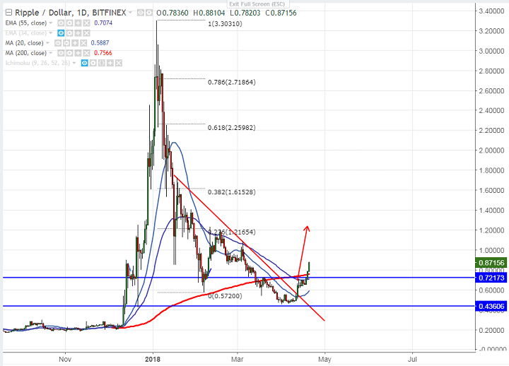 - Ripple is continuing its bullish trend for third consecutive days and from yesterday’s low pair has jumped almost 25%. The pair broken major resistance at 0.7450 (200- day MA) and jumped till 0.8814. The pair formed almost a double bottom at 0.4500 and any further weakness only below that level. it is currently trading around 0.87220.