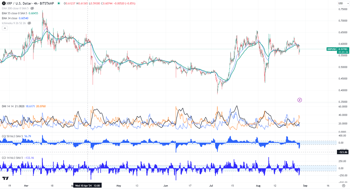 Ripple pared most of its gains yesterday on overall crypto market weakness. It hit a low of $0.5535 and is currently trading around $0.5781.
