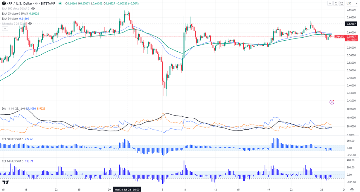 Ripple recovered sharply after a major development in the Ripple vs. SEC case.It hit a high of $0.65806 and is currently trading around $0.58986.