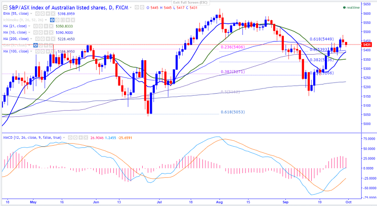 - ASX200 is trading well above Tenken-Sen (5374) and Kijun-Sen (5359) in the daily chart.