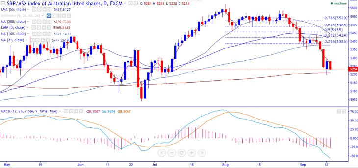 - The major support is around 5208 (200- day MA) and any close below targets 5150/5100 in the short term.