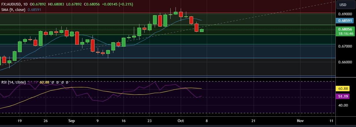 • Immediate resistance is located at 0.6832 (38.2%fib), any close above will push the pair towards 0.6858(SMA 9).