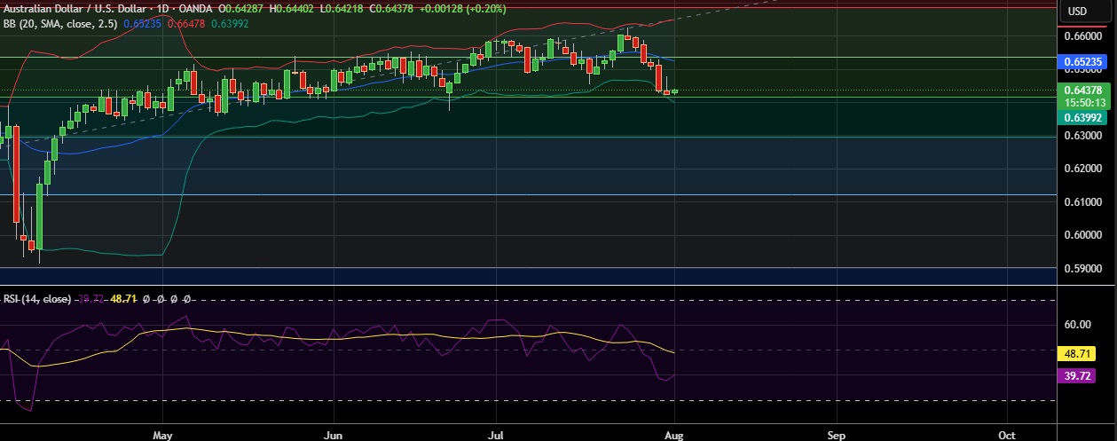 • Immediate resistance is located at 0.6480(July 31st high), any close above will push the pair towards 0.6536(38.2%fib)