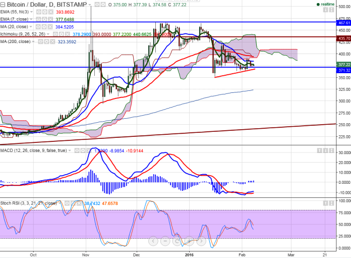 BTC/USD is trading in narrow range between $370-$380. It is currently trading around $376. Short term trend is slightly bullish as long as support $350 holds.