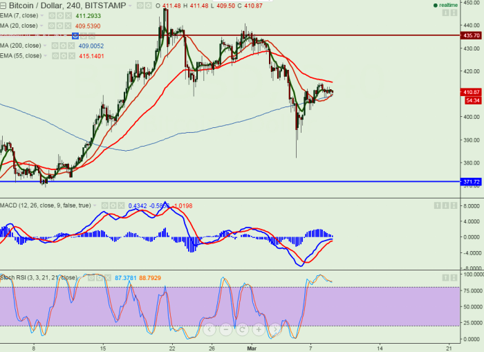 - BTC/USD has recovered till $415 after making a low of $382. It is trading around $410.