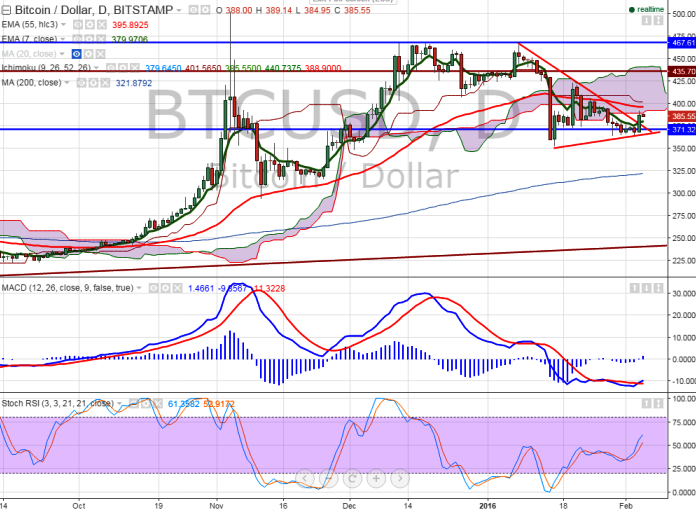 BTC/USD has formed temporary bottom around $363 and slightly jumped from that level. Short term trend is slightly bullish as long as support $350 holds.
