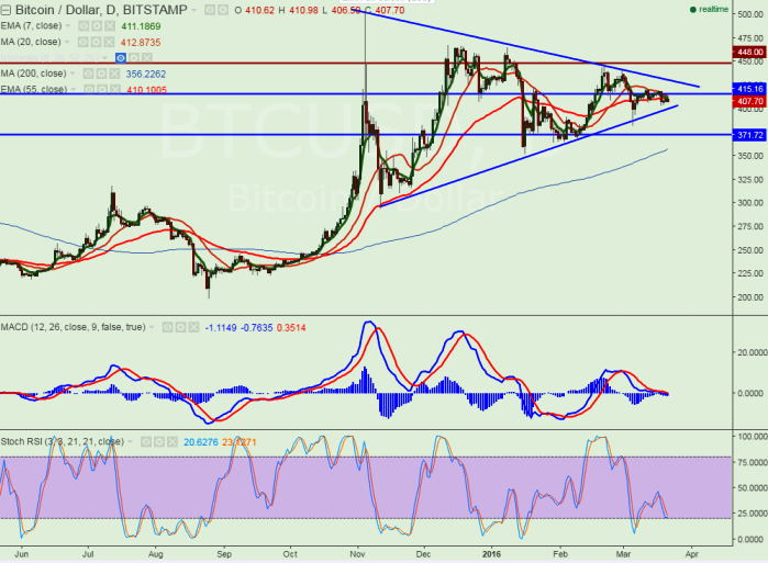 - BTC/USD has retreated till $403 after making a high of $422. It is currently trading around $407.