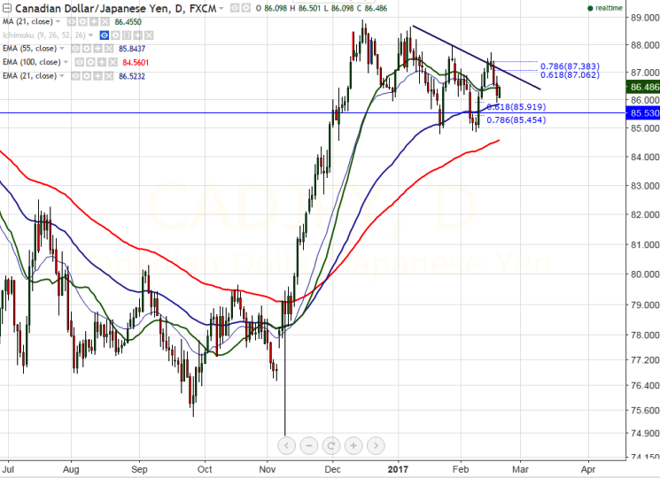 - On the higher side, any break above 86.50 (21- day MA) will take the pair till 87.06 (61.8% retracement of 87.72 and 85.91)/87.72 (Feb 15th 2017 high).