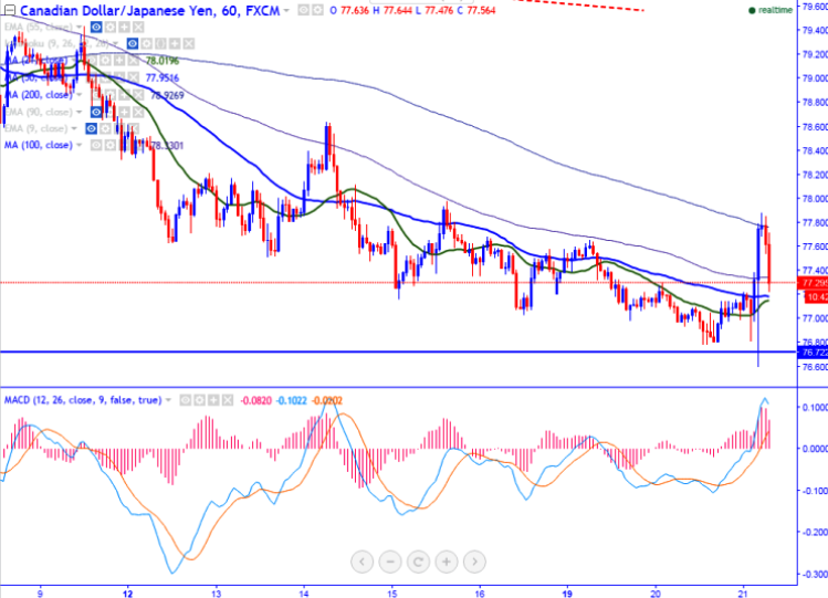 - The pair has jumped sharply till 77.88 in the morning after BOJ monetary policy and pared its gain from the high.