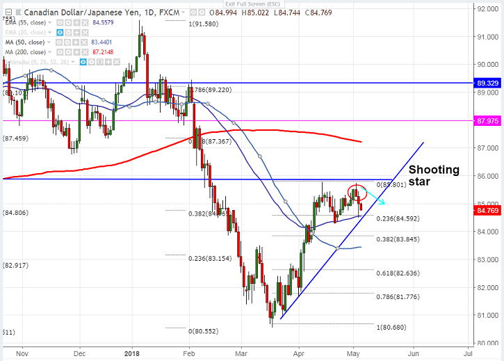 - The pair’s major near term resistance is around 85.75 (100- day MA) and any break above will take the pair 86.15/87.35 (61.8% fibo).