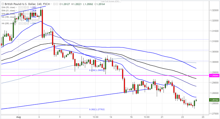 - The downside capped by 38.2% fibo at 1.27739 and any break below confirms minor weakness.Any break below 1.27739 will drag the pair down till 1.2700/1.2650 (200- day MA) likely. Market awaits Jackson Hole symposium for further direction.